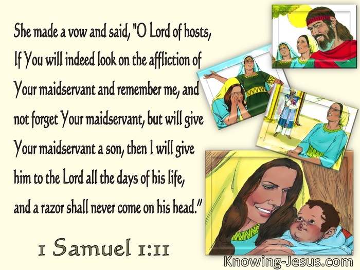 Then she made a vow and said, “O Lord of hosts, if You will indeed look on the affliction of Your maidservant and remember me, and not forget Your maidservant, but will give Your maidservant a male child, then I will give him to the Lord all the days of his life, and no razor shall come upon his head.”—1 Samuel 1:11