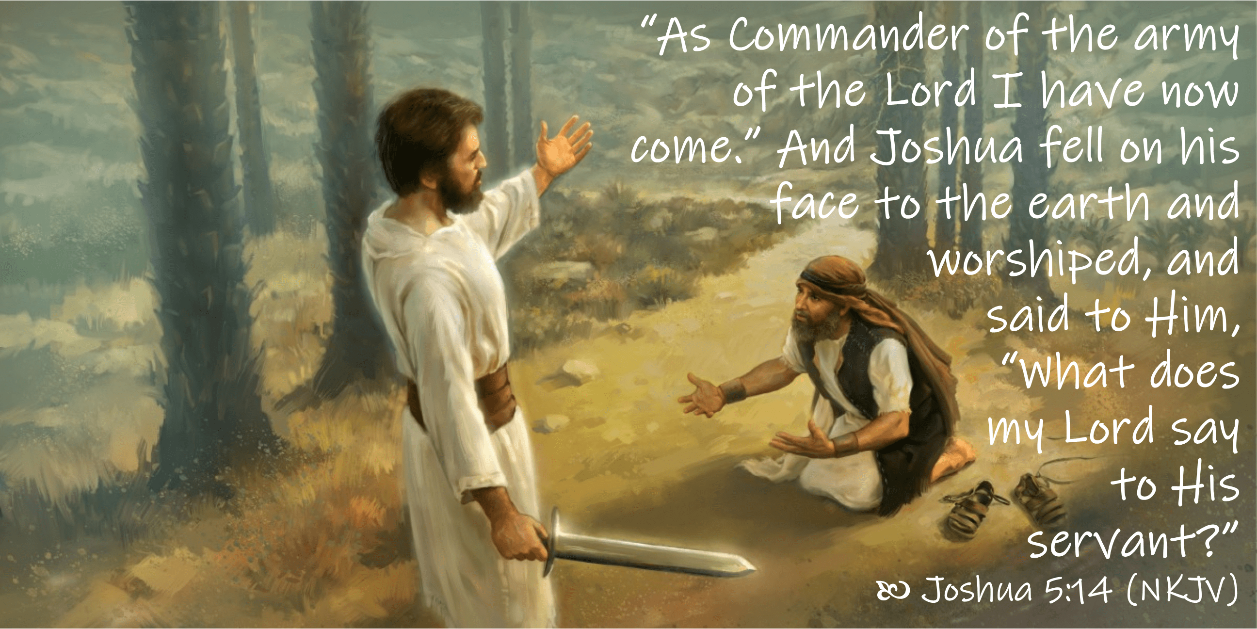 Joshua…lifted his eyes and looked, and behold, a Man stood opposite him with His sword drawn in His hand. And Joshua went to Him and said to Him, “Are You for us or for our adversaries?” So He said, “No, but as Commander of the army of the Lord I have now come.” And Joshua fell on his face to the earth and worshiped… —Joshua 5:13-14