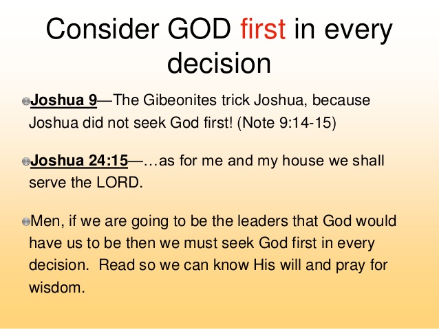 God specifically told the Israelites that they were not to make any covenant with the people in the land, but were to utterly drive them out. God knew that if the inhabitants remained, their practices would ultimately destroy His people. The Gibeonites realized they couldn’t stand against the armies of Israel, so they devised a scheme to make it appear that they had traveled from a far country in order to make a covenant with Israel. Joshua’s mistake was that he examined the evidence but didn’t inquire of the Lord. God would have warned him about this ungodly alliance, but Joshua didn’t seek God’s counsel. He just sized up the situation by what was before him. Some things seem so obvious. You shouldn’t have to bother God about those things; right? You can just go ahead and use your common sense.